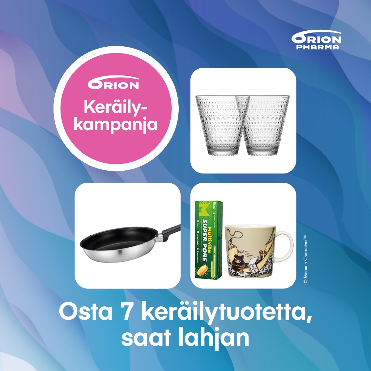 Valitse Iittalan Kastehelmi-juomalasit, Fiskarsin paistinpannu tai Moomin Arabia muki ja Multivita Super Pore.